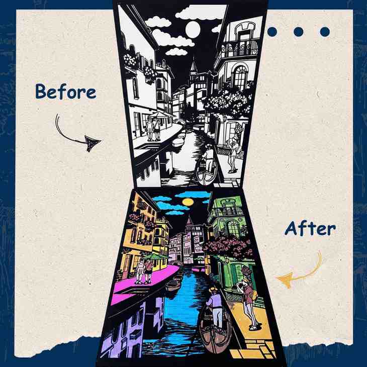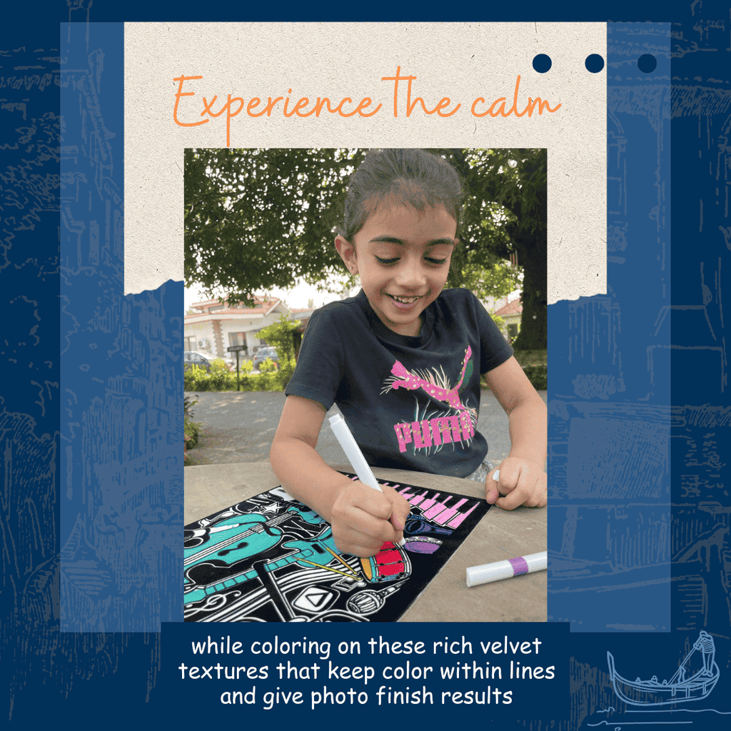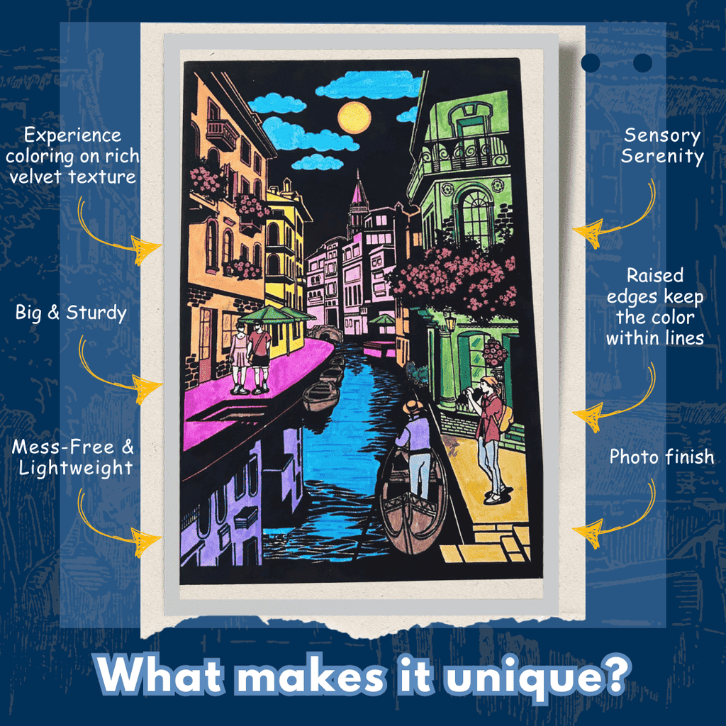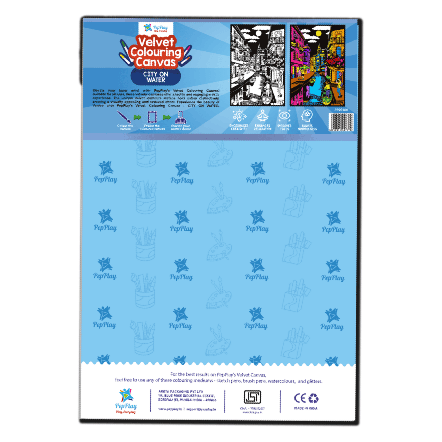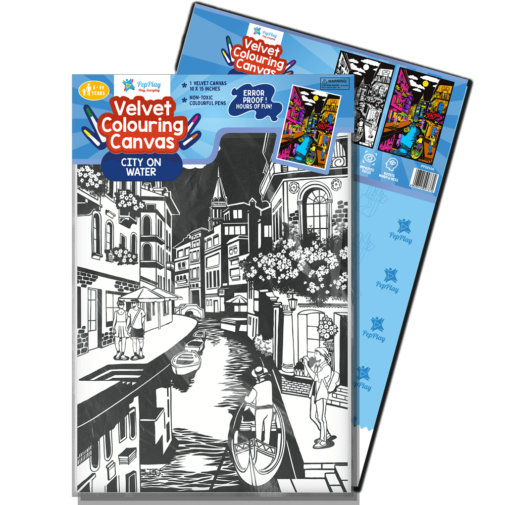 The PepPlay Velvet Colouring Canvas with “City on Water” theme offers a unique and sensory colouring experience for both kids and adults. With enchanting scenes of Venice riverside markets, bustling bridges, and charming waterfronts on premium velvet canvas, it’s not just an artistic activity but also a tactile and meditative one.