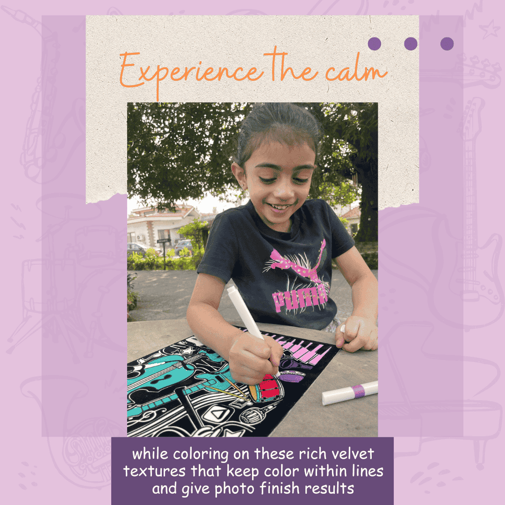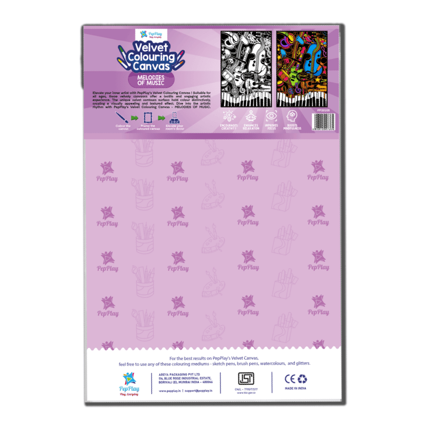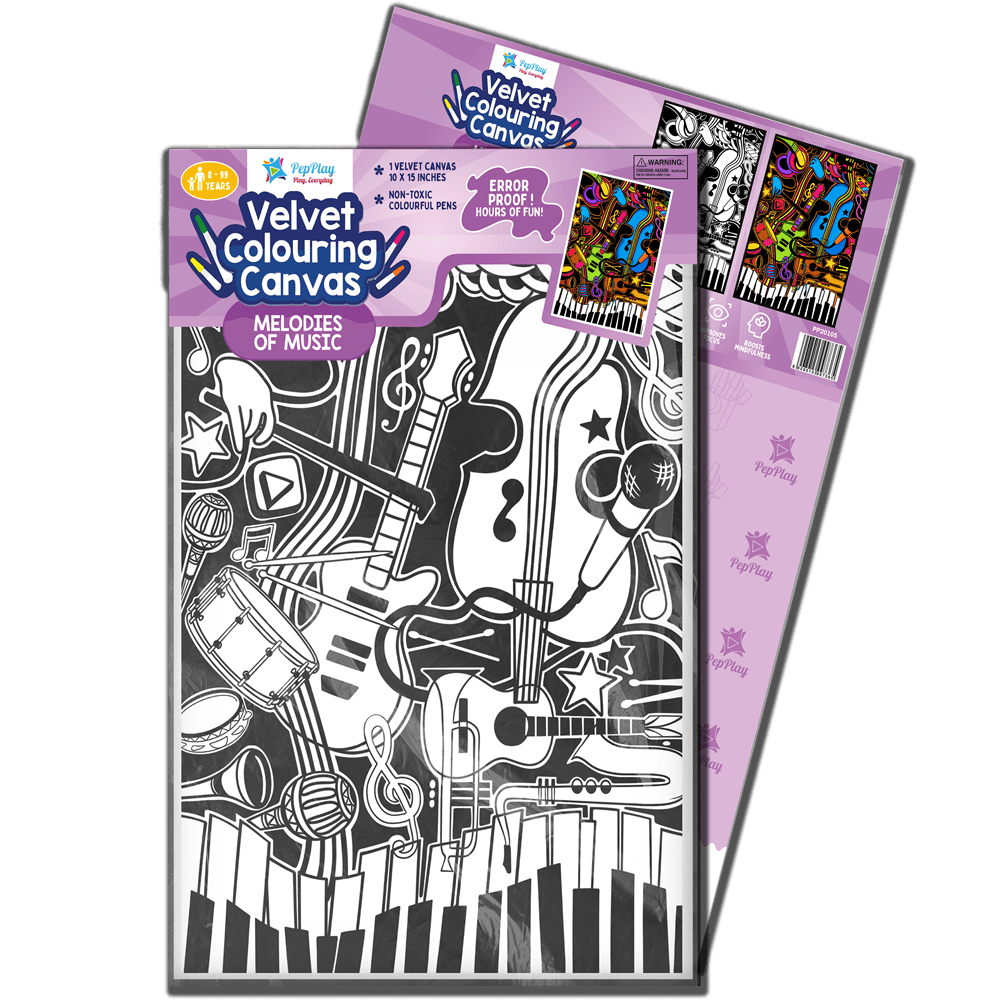 The PepPlay Velvet Colouring Canvas with “Melodies of Music” theme offers a unique and sensory colouring experience for both kids and adults. This unique velvet canvas features a harmonious medley of musical instruments, from pianos and guitars to violins and trumpets, intricately arranged in a captivating collage, it’s not just an artistic activity but also a tactile and meditative one.