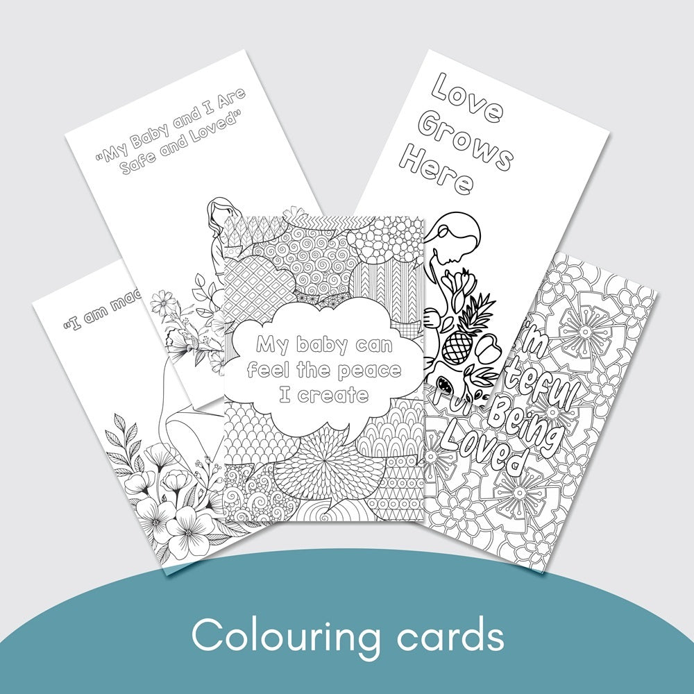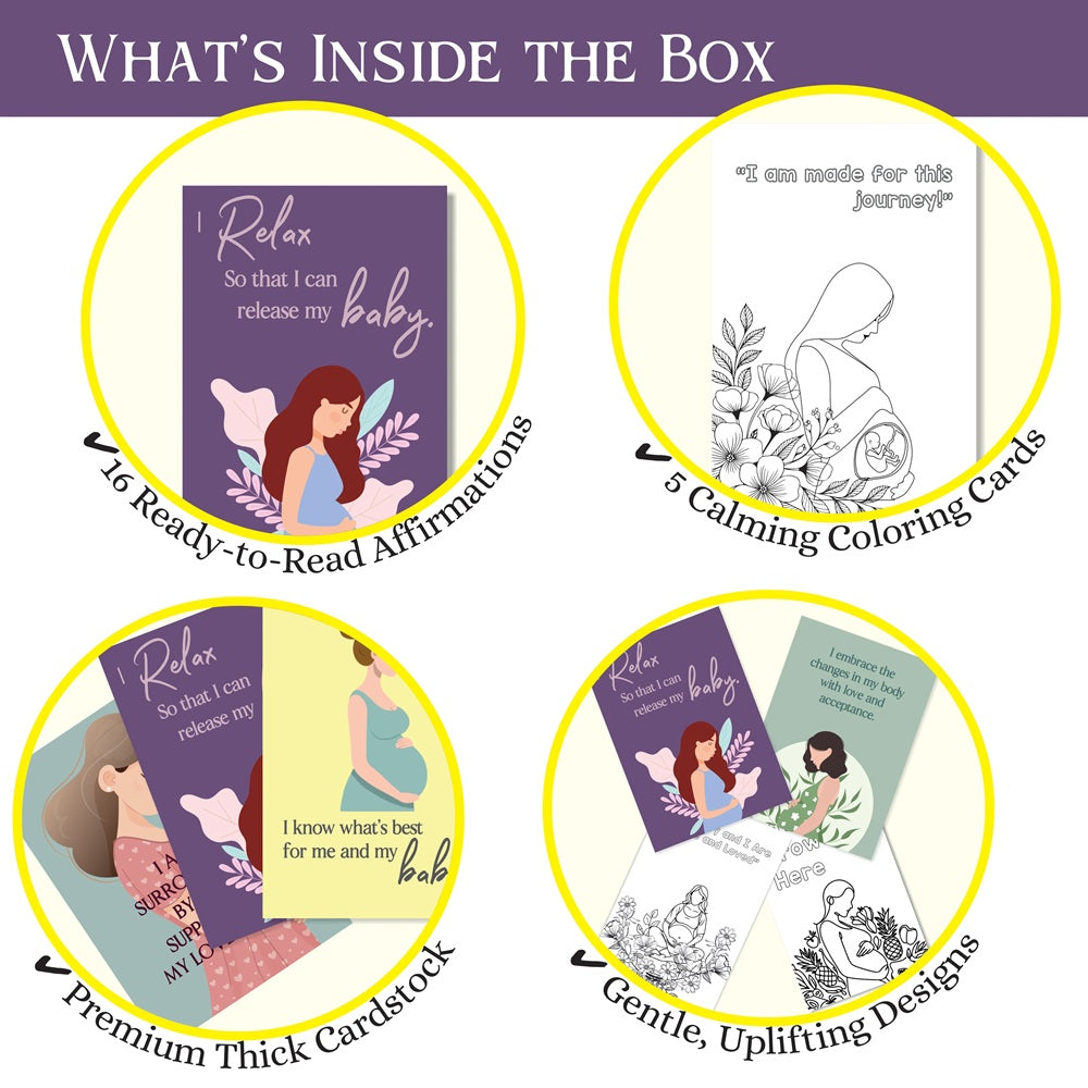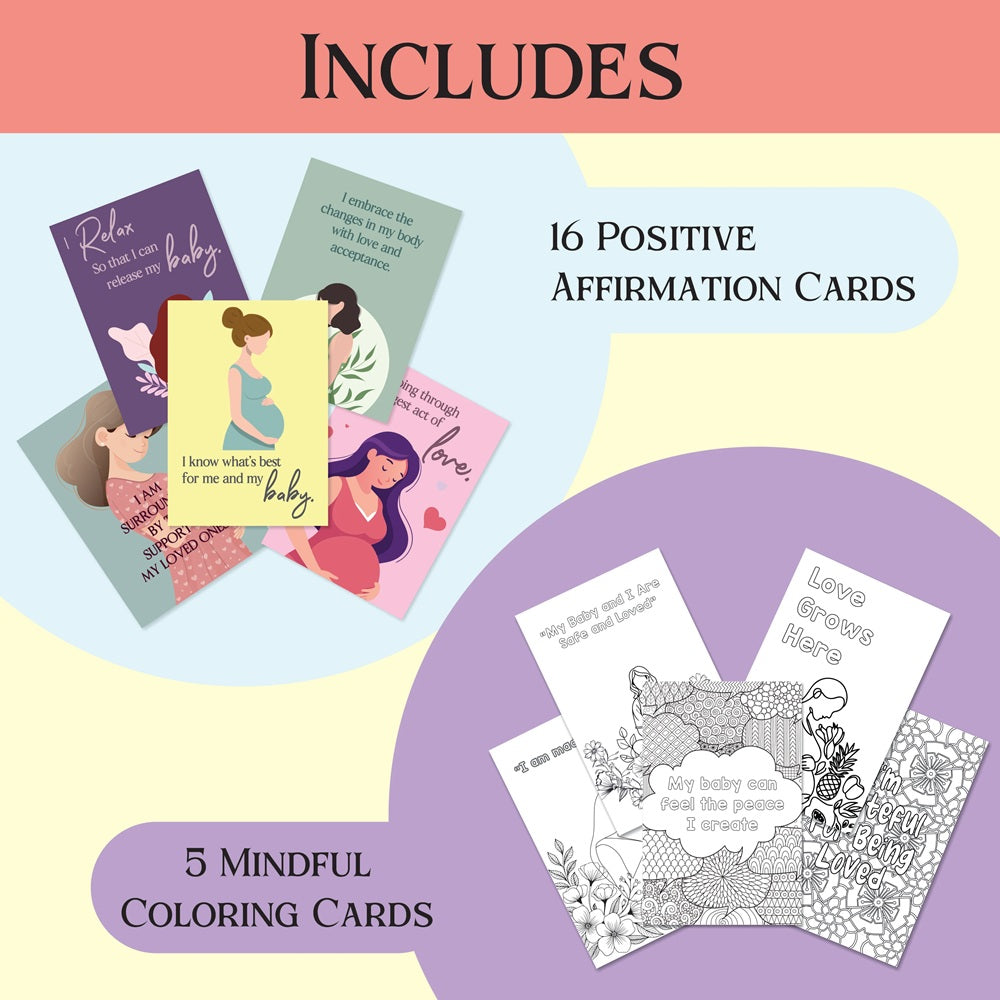 Includes: 16 positive affirmation cards + 5 mindful coloring cards to support emotional well-being throughout pregnancy.