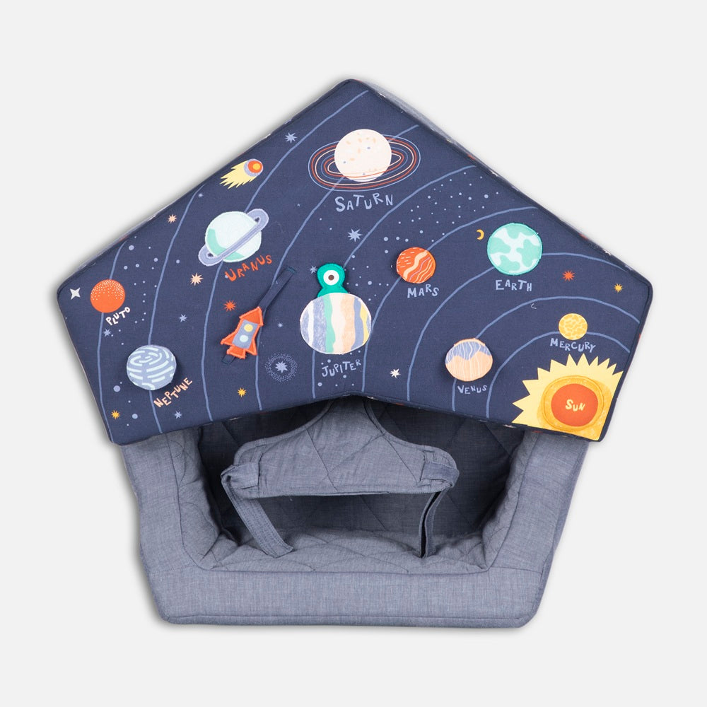 With our Baby Activity Center- Space in your orbit, playtime is always ready for liftoff. The chairs removable tray has plenty to keep curious cadets active and stimulated, from a mirror and rattle to squeakers. A cotton seat makes for comfy voyages through the imaginary cosmos, Activity chair should only be used on the floor and never placed on a table, chair or any other surface. Use only under adult supervision and never leave child in chair unattended. Use only with waist harness and tray secured into place. Handmade and embroidered.