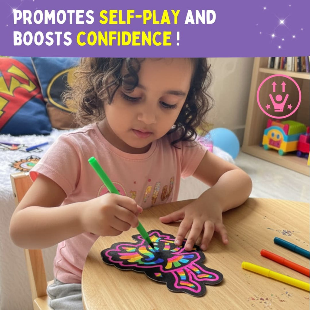 • Independent Play with No Screens or Mess This DIY activity supports independent play and creative expression. No glue or scissors needed—just open the box and start coloring.