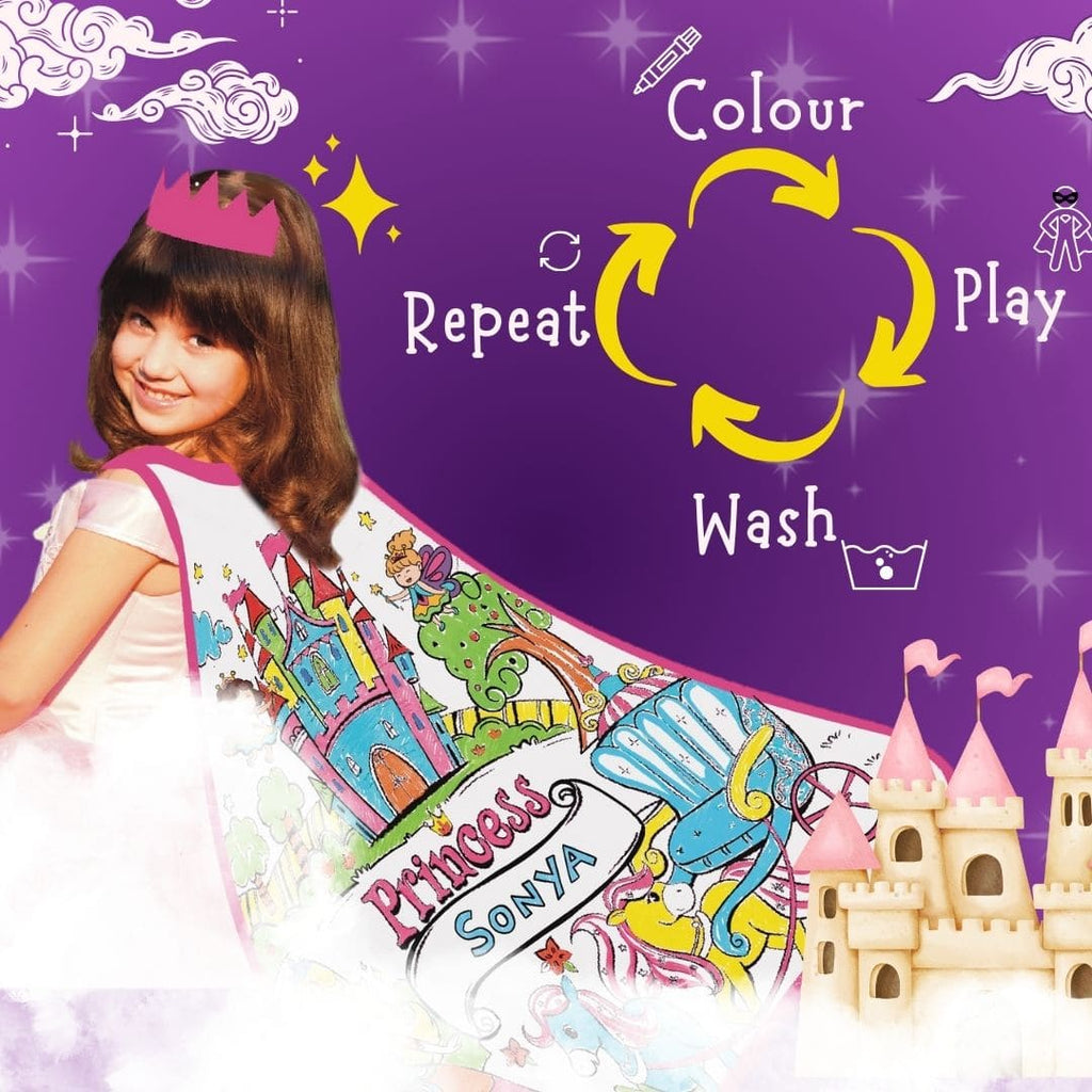 - High Quality - My Princess Cape Kit is made from high-quality materials that are designed to last. The fine cotton cape is soft and comfortable, with a durable Velcro neck closure that ensures a secure fit. The washable non-toxic markers are of excellent quality, producing bright and vibrant colors that will not fade or smudge, even after multiple washes.