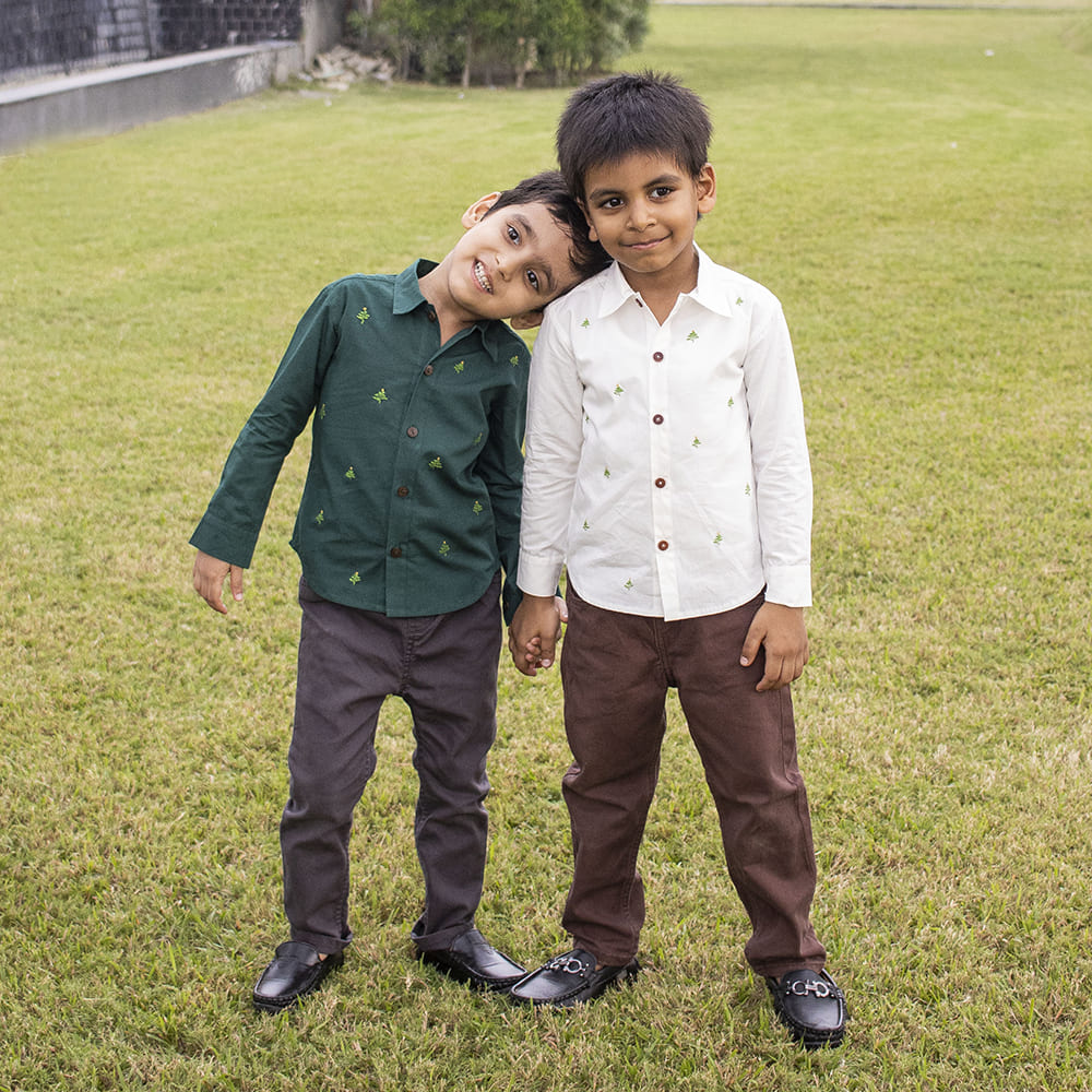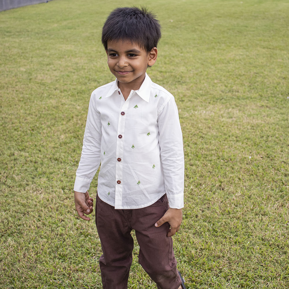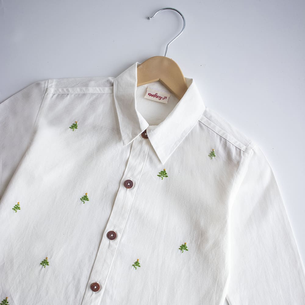 Our classic Frost shirt with a pretty hand embroidered Christmas trees will be your go to shirt for Christmas parties. Roll up the sleeves or keep them crisp straight, jeans or trousers, stylize it your way for a casual Christmas day outing or a party. Designed with a shirt collar, button placket and long sleeves, this shirt is made of 100% organic cotton for uber comfort.