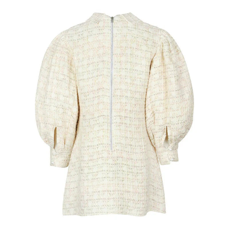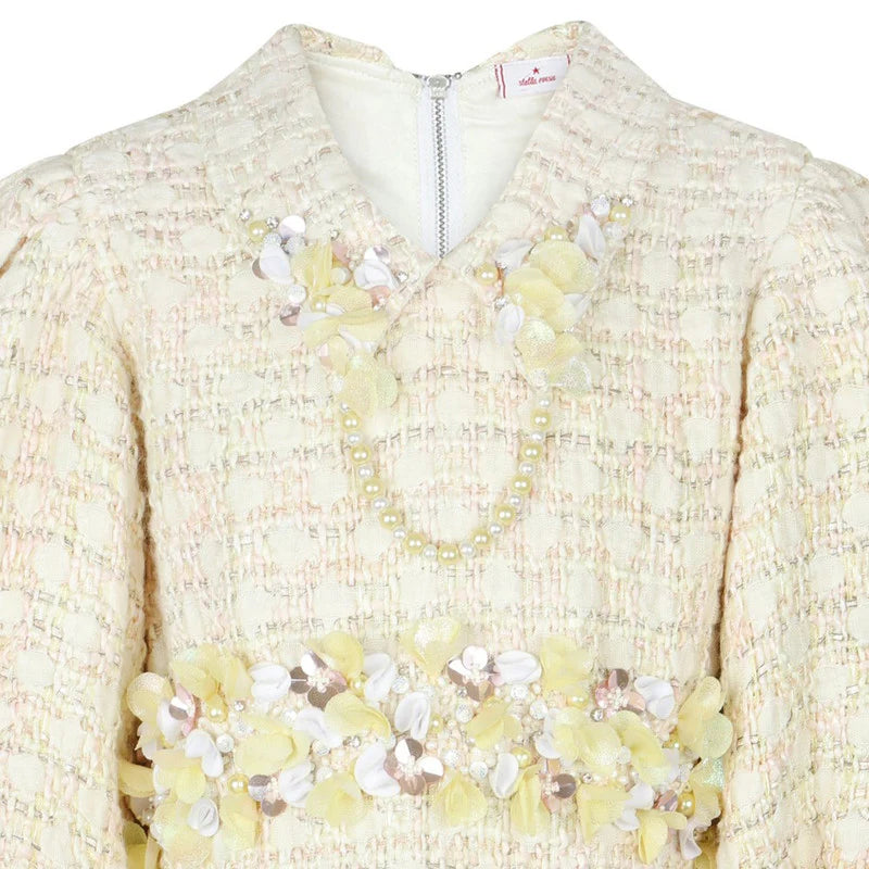 Elegant yellow pearl tweed dress for girls. Long sleeves, collar, and exquisite pearl detailing at waist and collar.