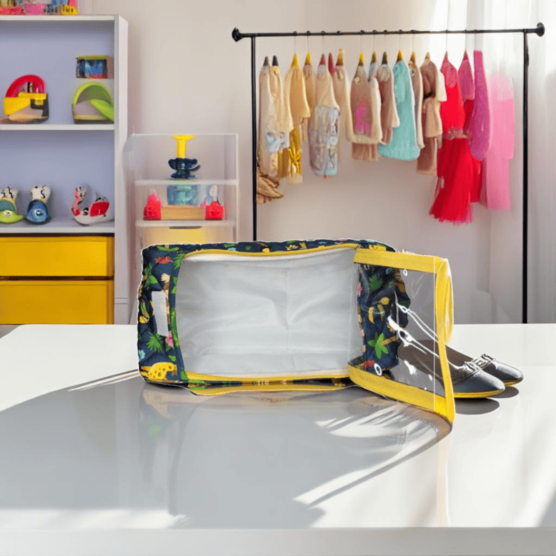 Shoe Organizer is perfect for travelling with kids. It has a transparent front to easily spot your kid's favorite footwear and a water-resistant inner lining for those wet, adventurous days. It fits up to 4 pairs of kids shoes and comes with colorful prints so they can choose their favorite. Additionally, the option to personalize the organizer with your child's name adds a distinctive touch, making it uniquely yours.
