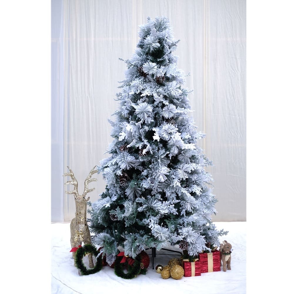 Adorn your home in a stunning, snow-covered dreamscape with the True Star christmas tree by Swen. This captivating tree is heavily blanketed in pristine white flocking, evoking the breathtaking beauty of a truly frozen winter landscape, and is thoughtfully adorned with rustic natural pinecones. Each branch is crafted of beautfiul broad pine leaves that are generously layered with a dense, pristine white flocking, creating an incredibly realistic "fresh snowfall" effect.