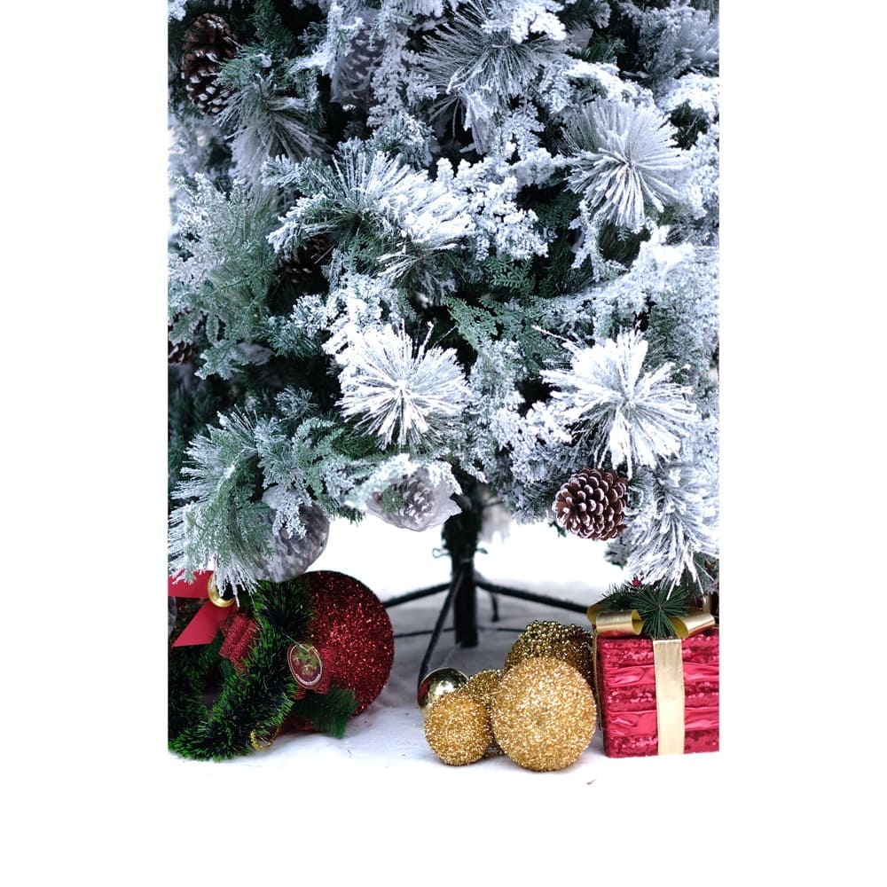 The charming natural pinecones nestled among the frosted branches add a touch of earthy warmth and complete its picturesque winter forest appeal. True Star is a beatifully voluminous tree that is made from premium Polythylene (PE) material. It is furnished with a sturdy metal stand for easy installtion and assembly. Simply place the stand provided on the floor and then place one component into the other by means of the central rod. The tree features hinged branches for incredibly easy assembly as well as for folding for storage.