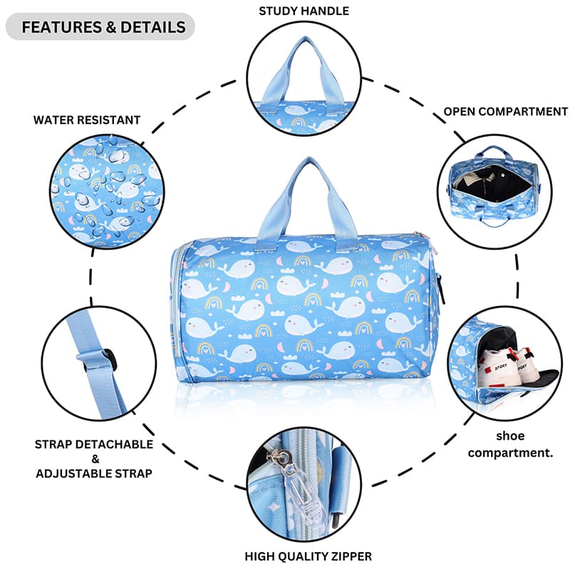 Adds a playful touch to your child's style while keeping their belongings organized.Water resistant material .Shoe compartmentt on the side.
