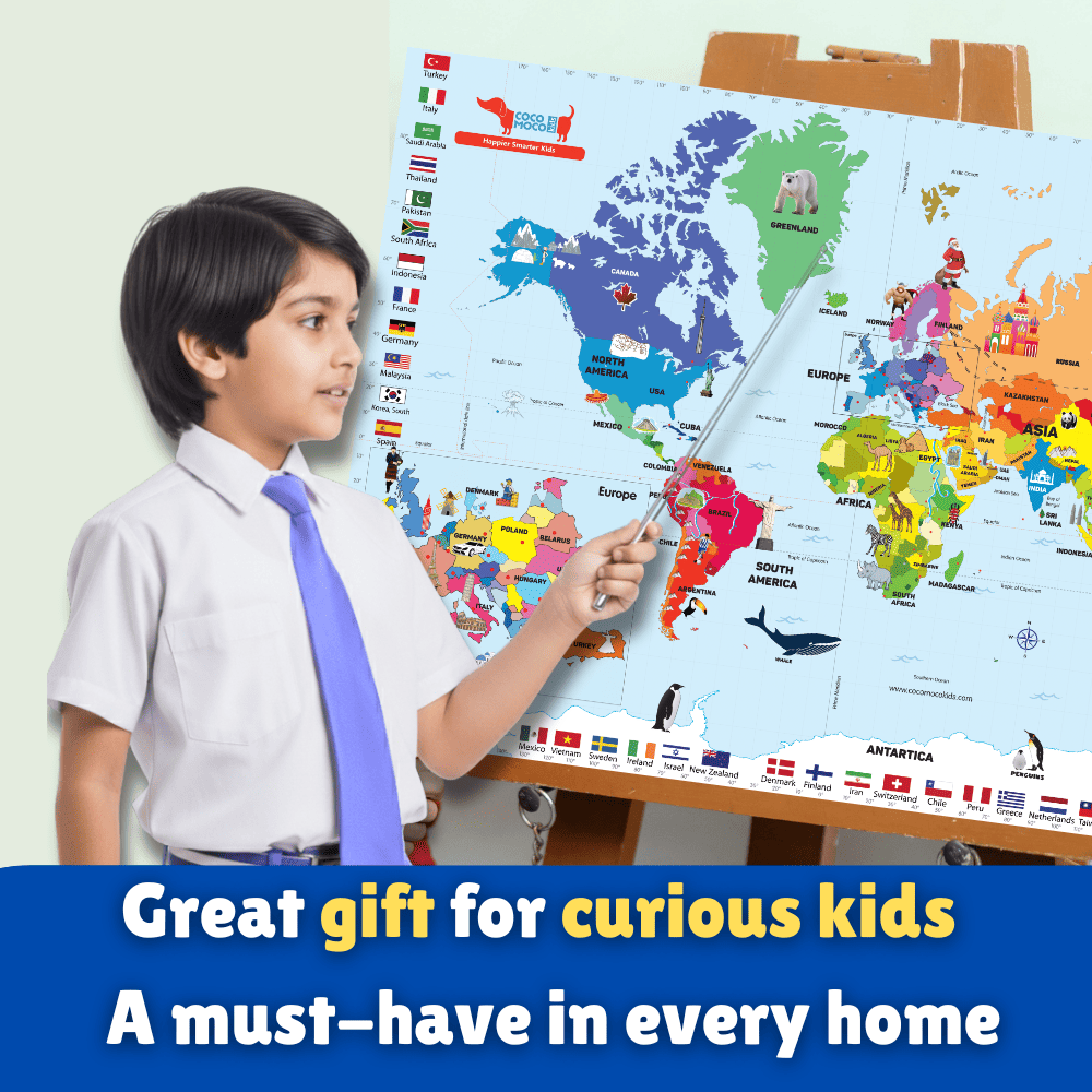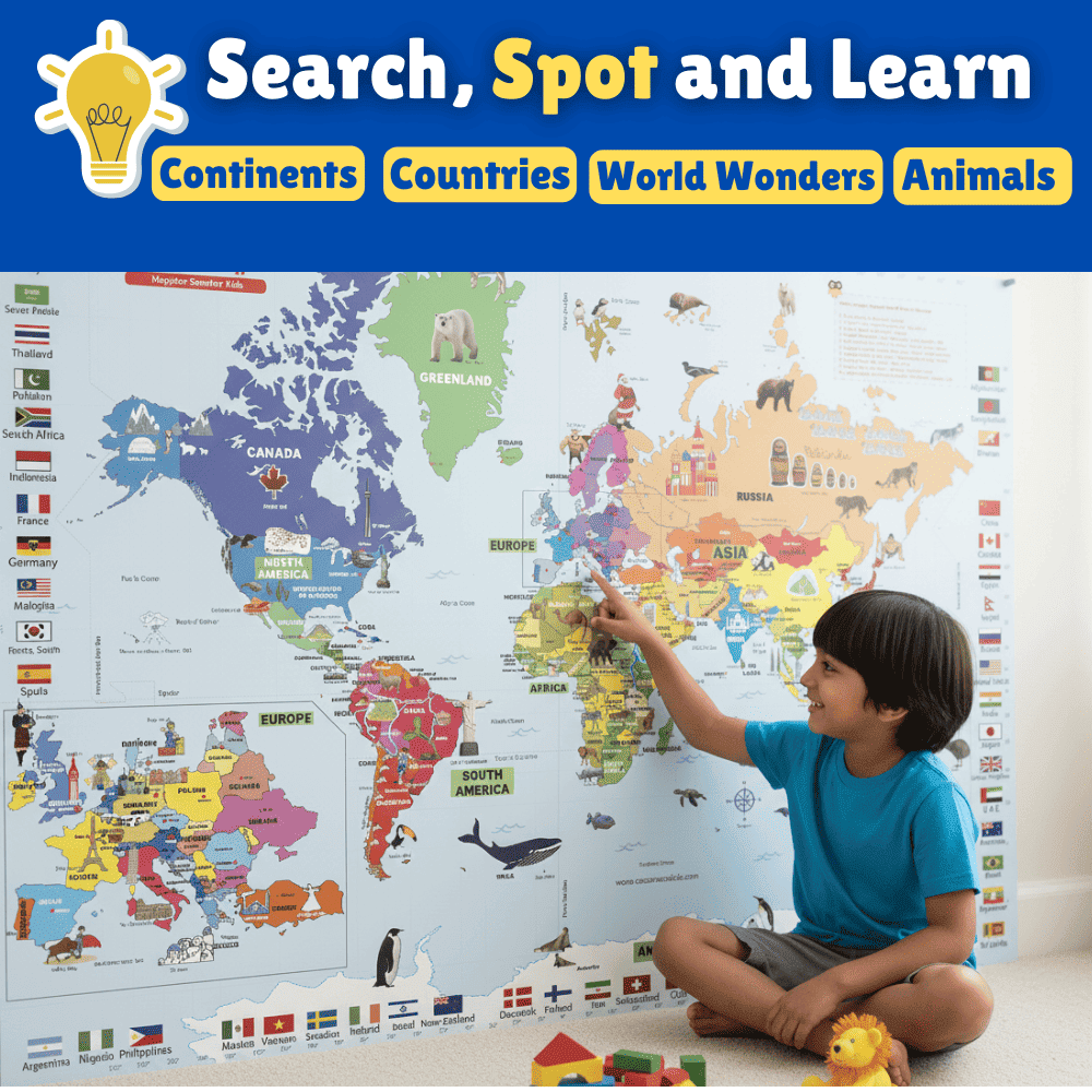- Giant Non-Tear World Map: 6 feet x 4 feet big world map for kids. Creative and fun way to learn and explore different countries, capitals and more on the map.