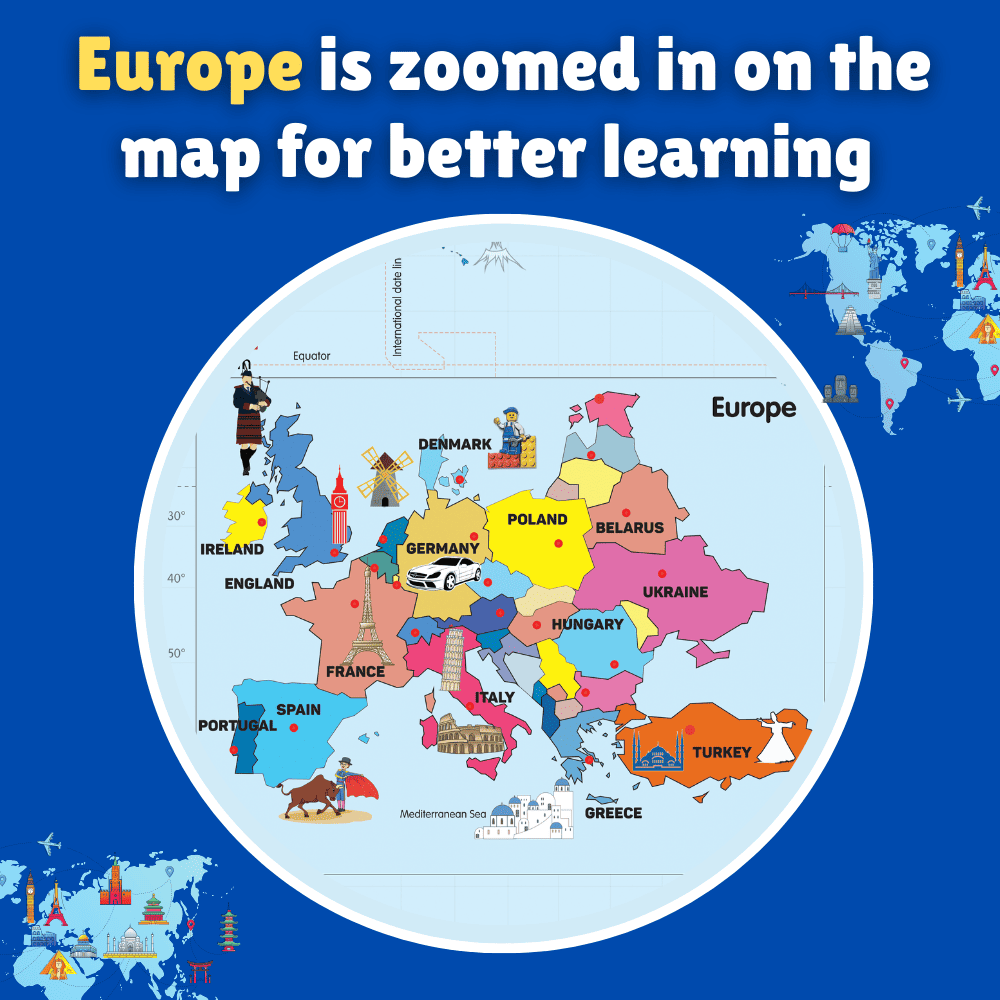 - Colourful monuments, animals, famous places beautifully drawn and illustrated on the map for teaching kids geography