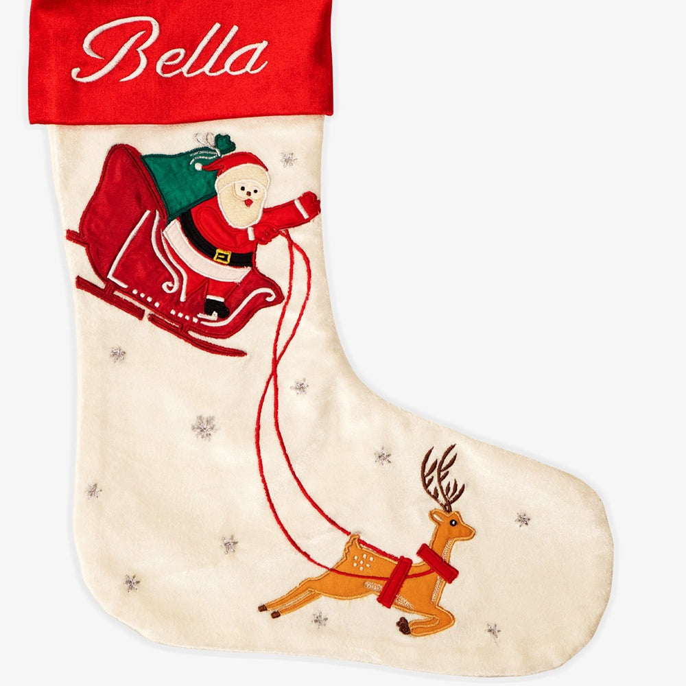 Santa Claus rides his iconic sleigh in this luxe velvet stocking, holding a vibrant sack brimming with toys and treats, ready to spread holiday cheer.