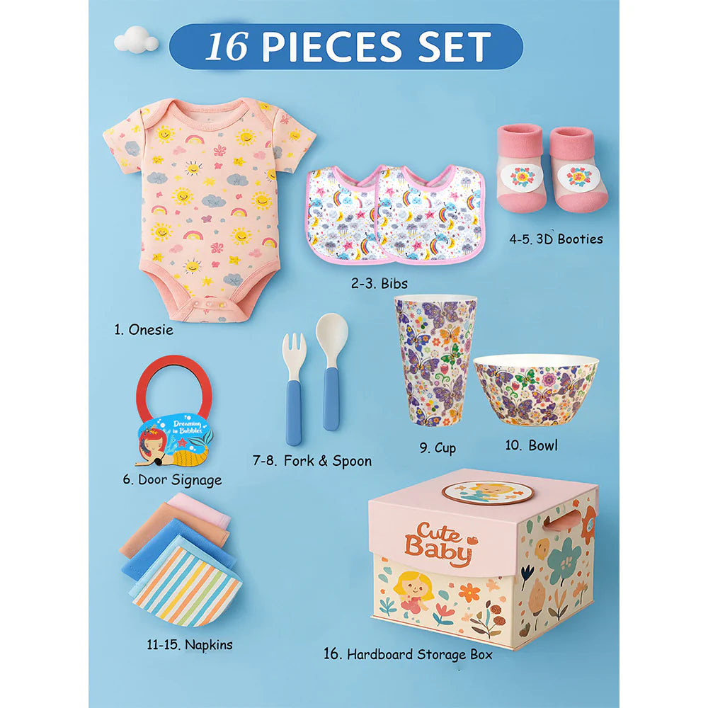 • 16 Pcs Assorted Gift Hamper Set: This stunning 16 pcs Gift Hamper set is a beautiful assortment of exclusive essentials for a baby girl.