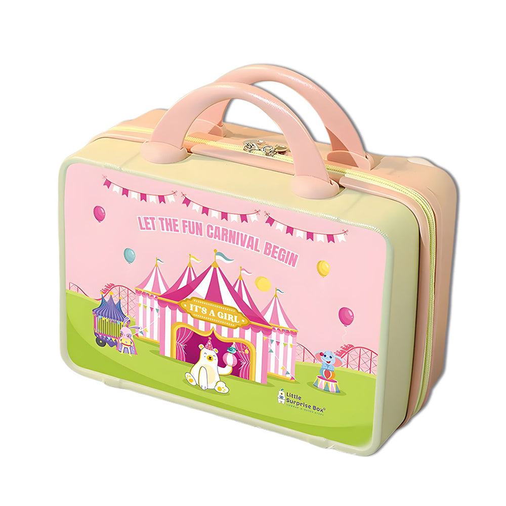 Mini Carnival-Themed Suitcase: This hamper comes beautifully packed in a matching, high-utility hard case travel suitcase with an adorable carnival theme. Designed to conveniently store and carry baby essentials, the suitcase is sturdy and lightweight, making it both a practical storage solution and a heart-warming keepsake that new parents will love.