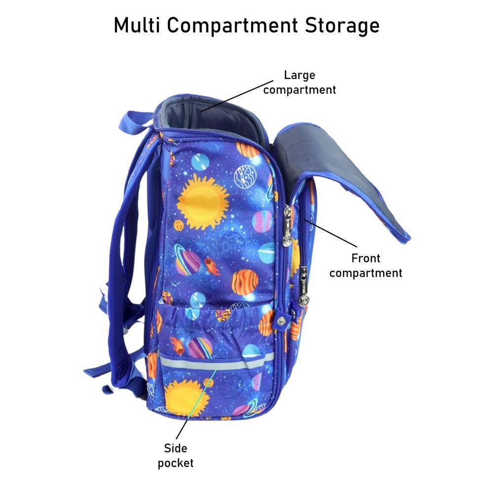 Design: An attractive 2d Embossed Rubber front fade design which makes the bag extra attractive and adorable compared to the other backpack options available in the market. The adorable galaxy theme is a total stunner and fun piece to have.