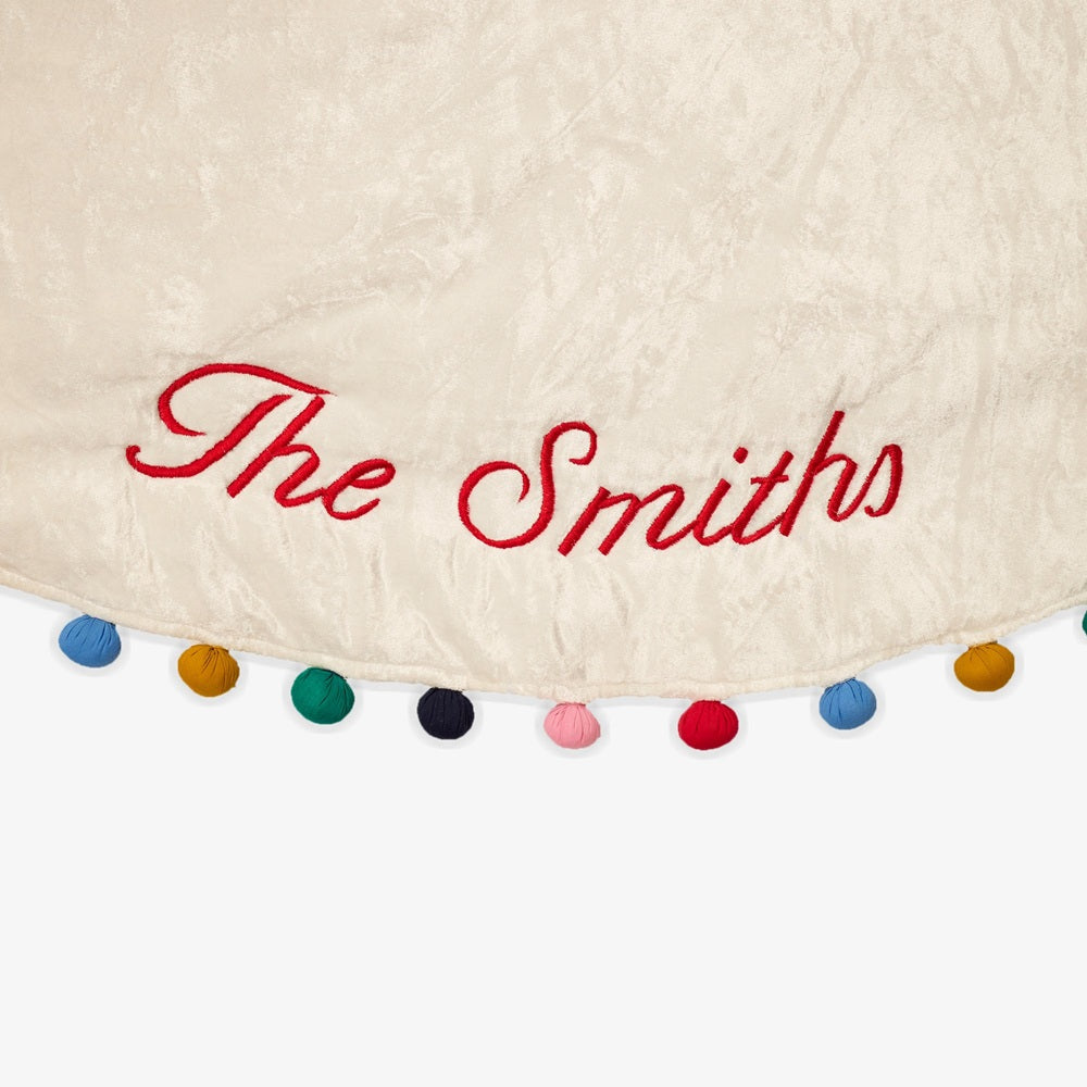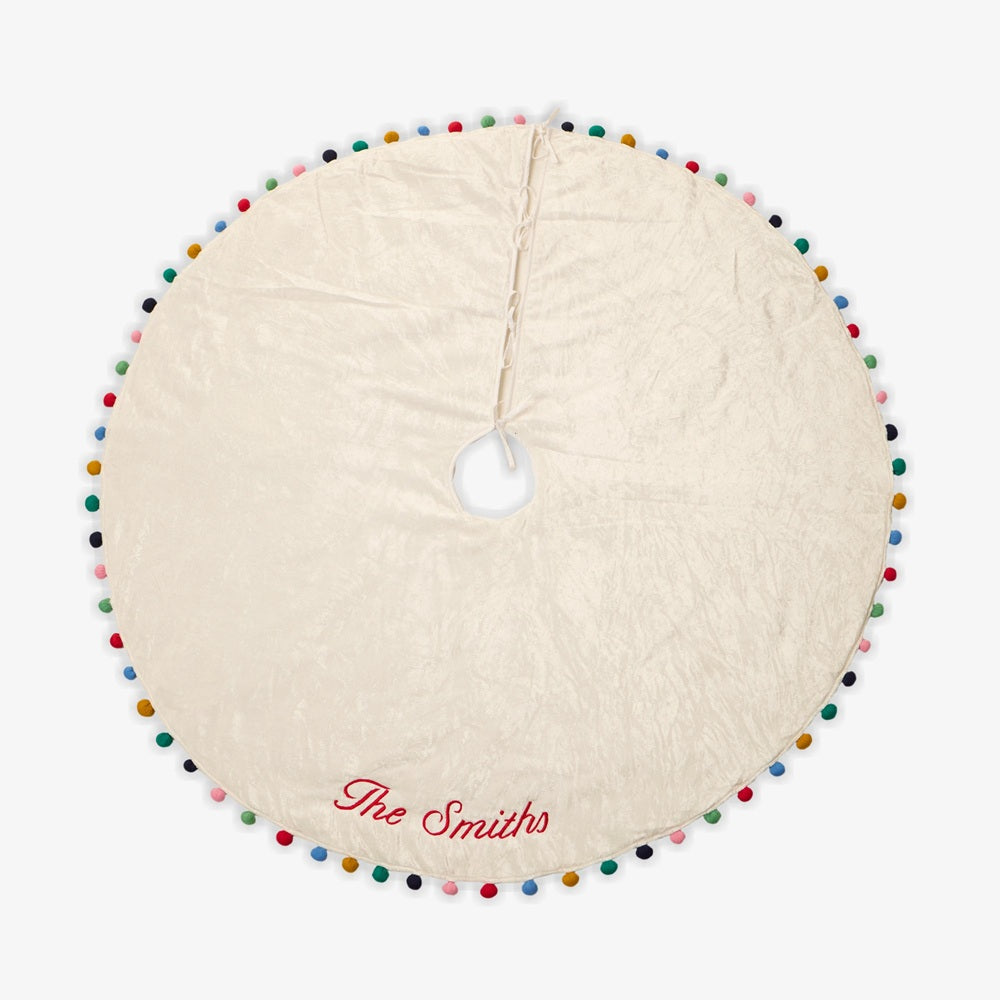 The colorful pom-pom luxe velvet Christmas tree skirt features a vibrant array of soft, fluffy pom-poms in a mix of festive colors. This playful tree skirt will beautifully frame the base of the tree while bringing a joyful, cozy vibe to your celebrations. Perfect for placing your carefully wrapped gifts, it creates an inviting spot for holiday surprises to be unwrapped on Christmas morning! Don’t forget to personalize it (for free) with your family name for a unique touch that will make your holiday memories even more special.