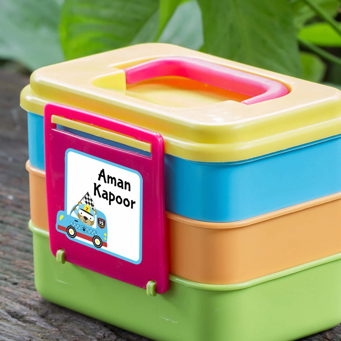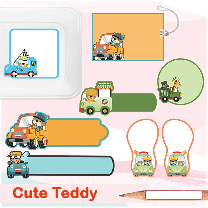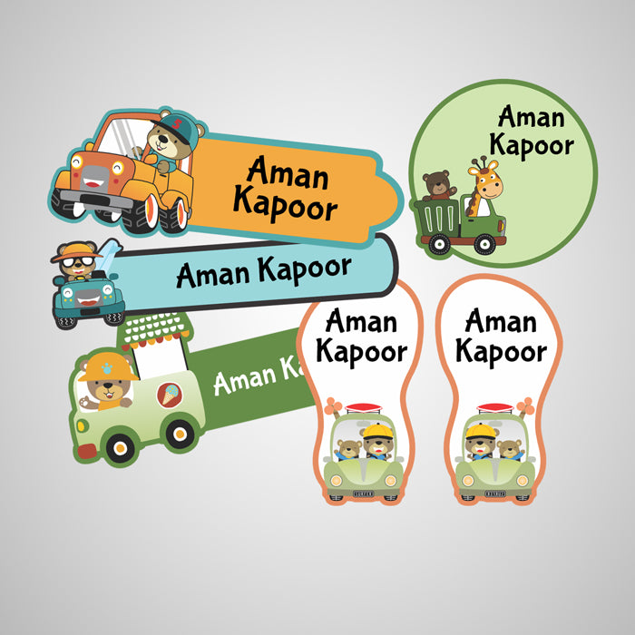 We've made Cute Teddy Bear in charge of carrying your kid's name on his belongings. On some stickons, you'll see him having fun with giraffe while on others he is seen driving cars and a ice cream van. The thought behind the stickon is inspired by the imagination of kids.