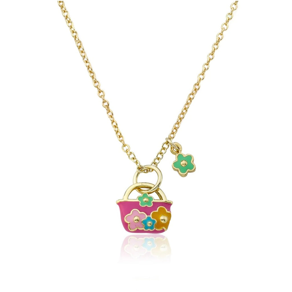 Hot Pink Purse Accented with Multi Color Enamel Flowers & Pink Chain Necklace 14k gold plated