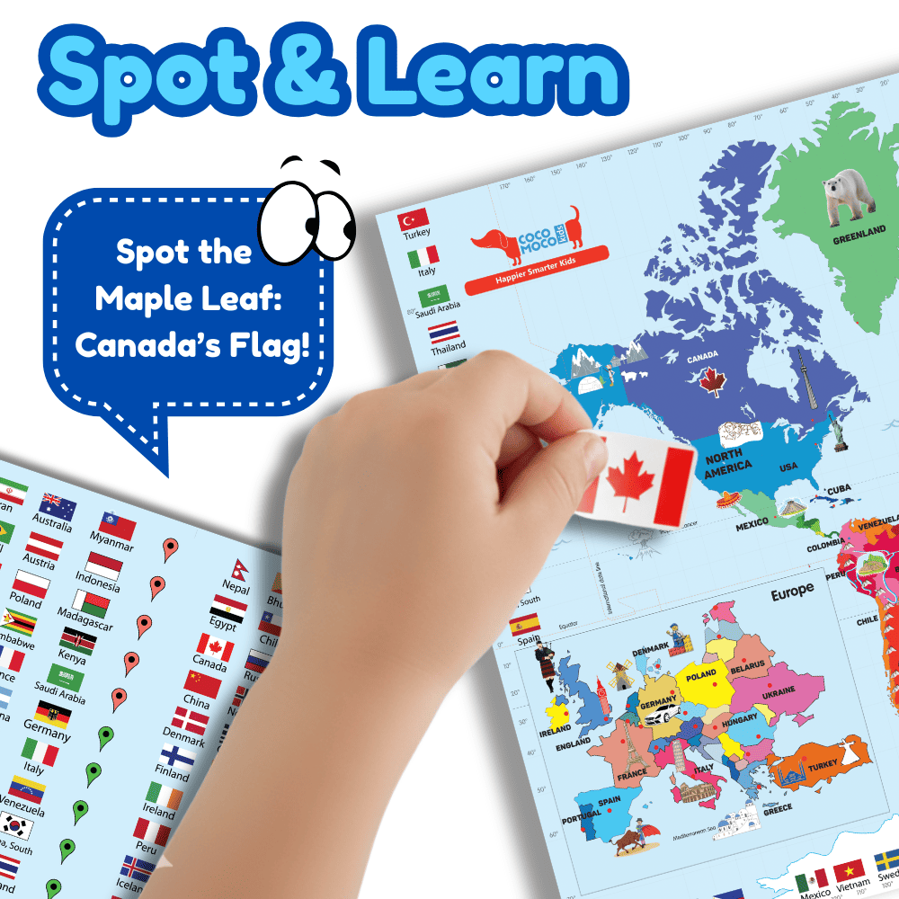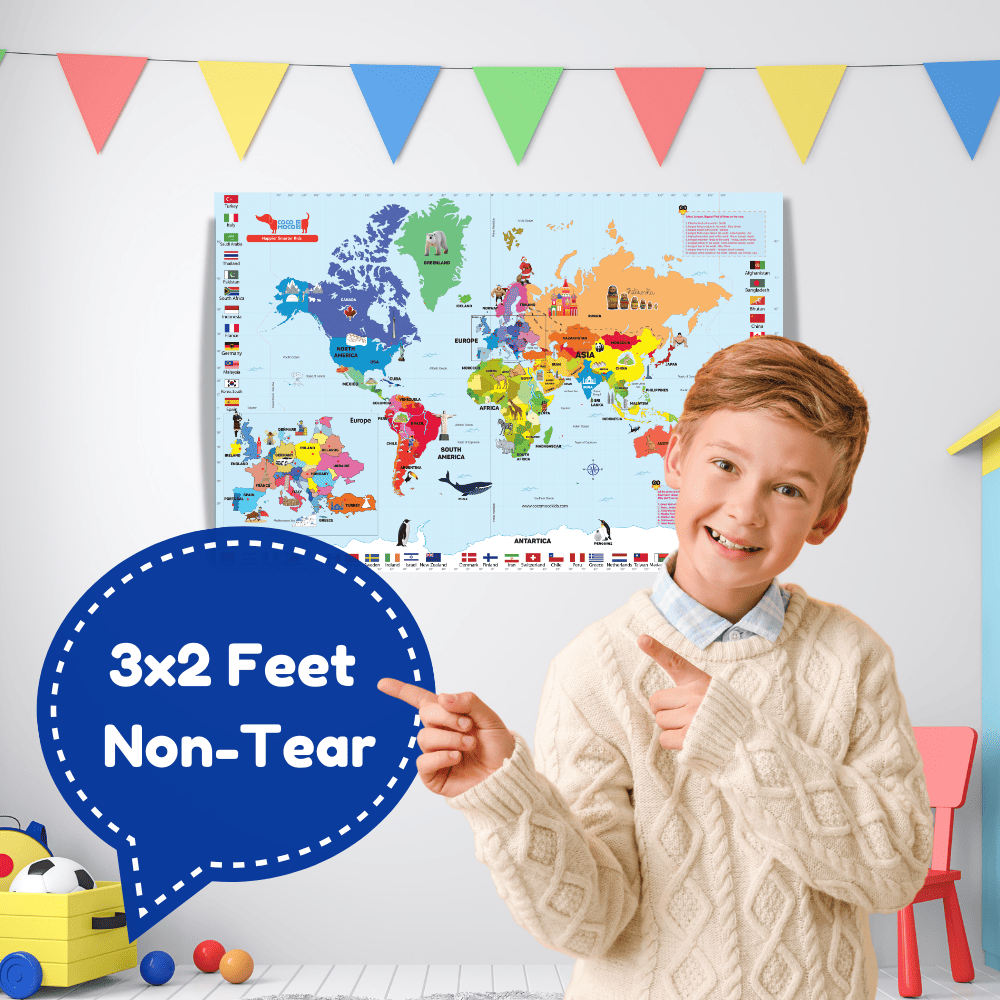 Turn your child into an world explorer with this beautifully illustrated World Map Poster for Wall. A perfect addition to your room decor, the world map is 3 feet wide and 2 feet tall and is made of a water proof non tear material. It illustrated pictures of monuments, animals and famous things from around the world. You also get 100s of stickers of flags, currencies, labels of monuments, famous places and animals. Make learning exciting with these geography games for kids and learn about countries, capitals, continents, flags. Flat maps are more interesting than plain political world maps, atlas and globes. Large world map is full of pictures drawn on it and makes children curious to learn! Throw an Around the World or Travel Theme or Airplane Theme Birthday Party and use these as party favors and return gifts for kids birthday party or just give as birthday gift for kids - boy and girls .