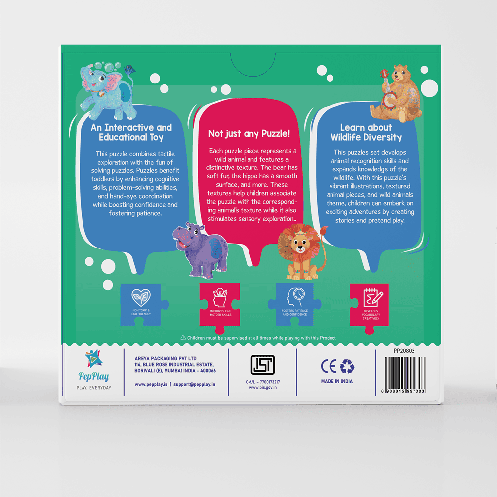 Wild Animals offer toddlers an engaging and educational experience by blending tactile discovery with puzzle-solving fun. Featuring four distinct wild animals – Lion, Bear, Elephant, and Hippo – each puzzle piece boasts a unique texture, such as soft fur for the bear and a smooth surface for the hippo. This hands-on approach fosters fine motor skill development and sensory engagement.