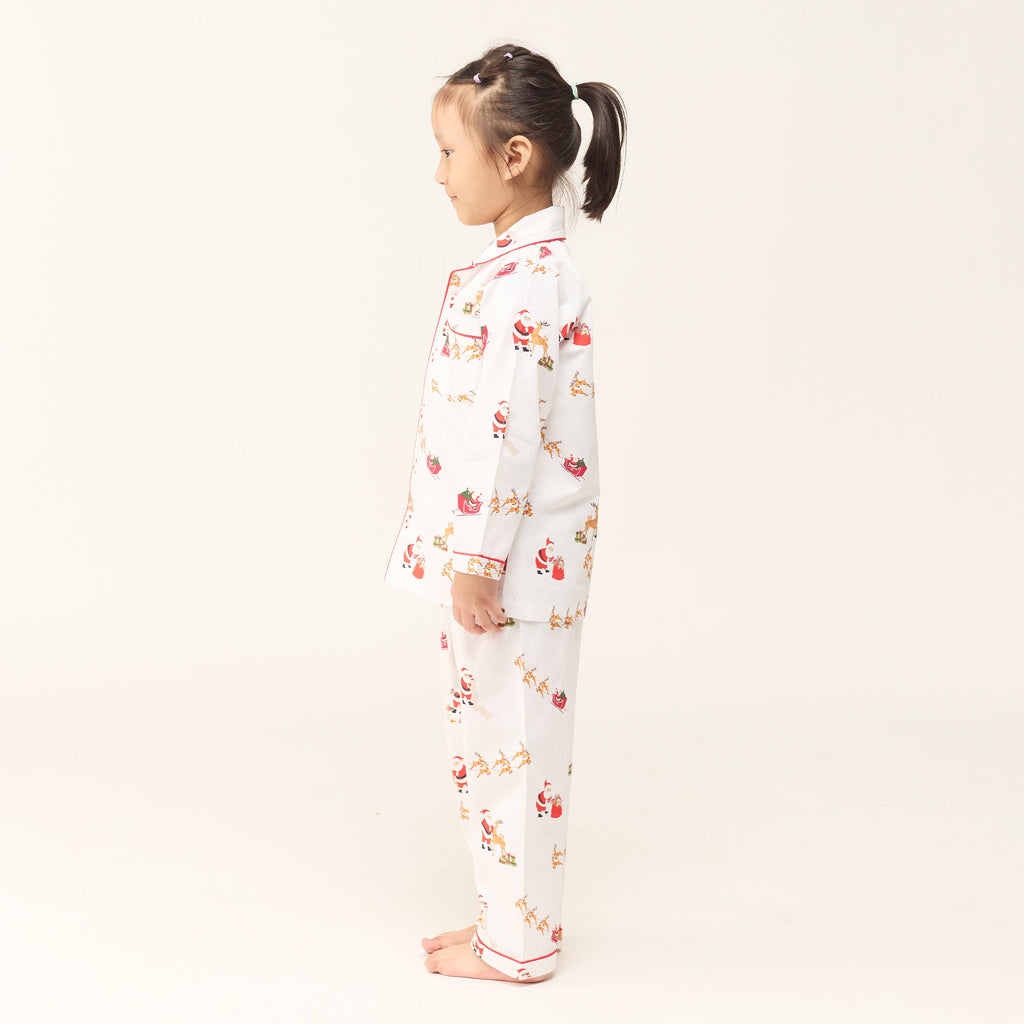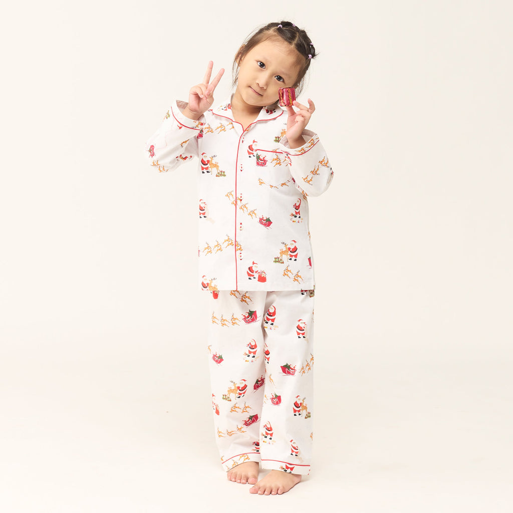 Get into the holiday spirit with this festive pajama set depicting Santa preparing for Christmas, surrounded by toys, his sleigh, and his cheerful reindeer!