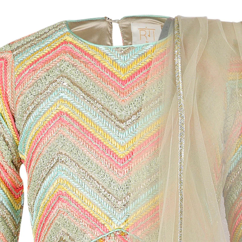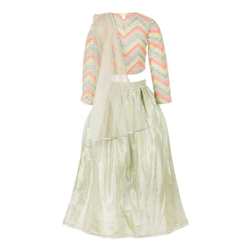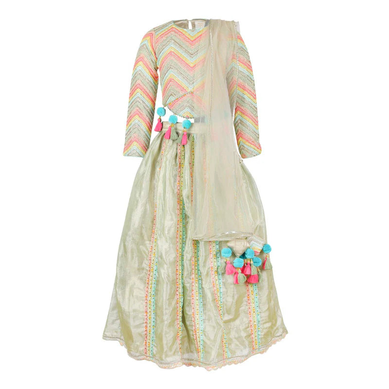 This charming girl's Lehenga features vibrant embroidered work that adds a playful touch to any wardrobe. The intricate designs are complemented by delightful tassels, enhancing the dress's overall appeal. Crafted from high-quality materials, it ensures comfort and durability, making it perfect for both casual outings and special occasions.