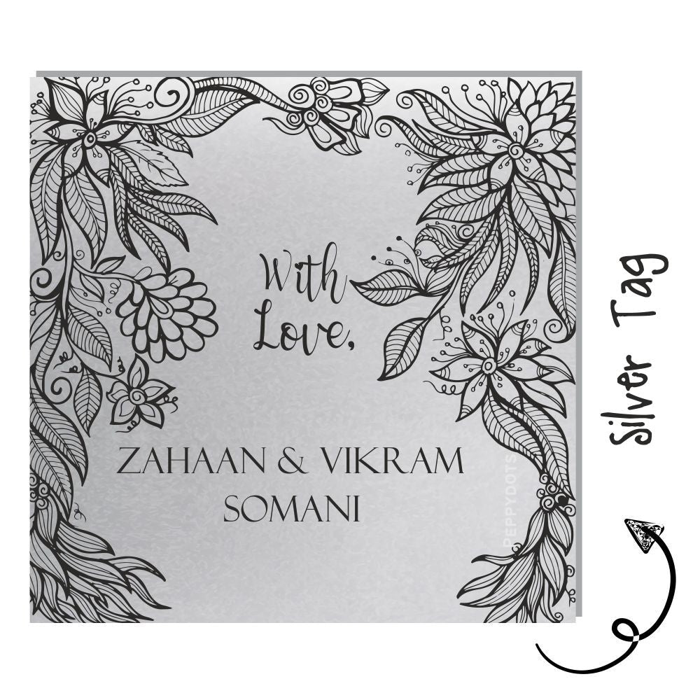 These silver mettaic tags are elegant and classy. These personalized tags are perfect for festive or any other gifting.