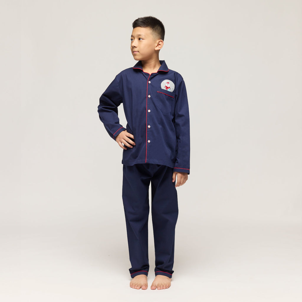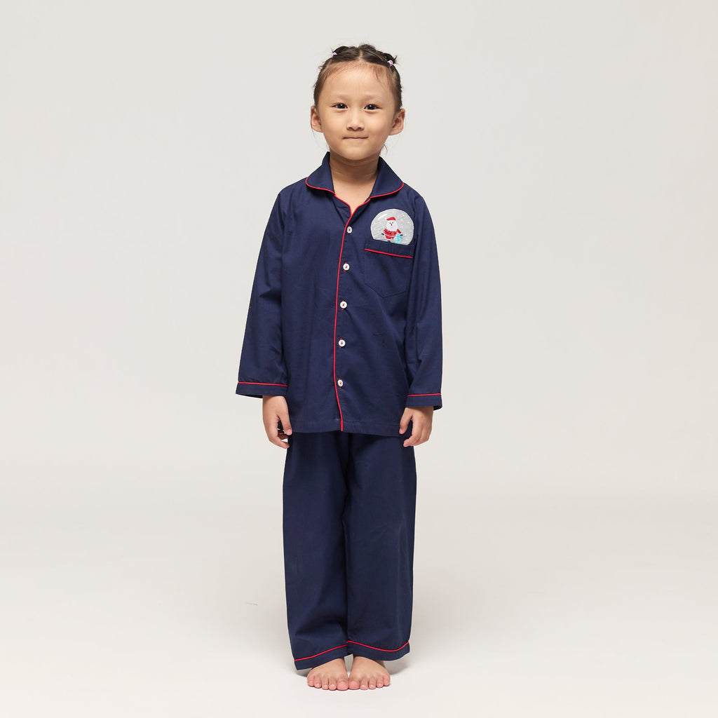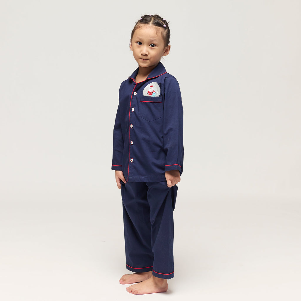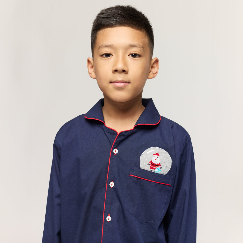 Cozy up in this holiday pajama set showcasing a charming snowglobe with Santa happily holding his sack of gifts!