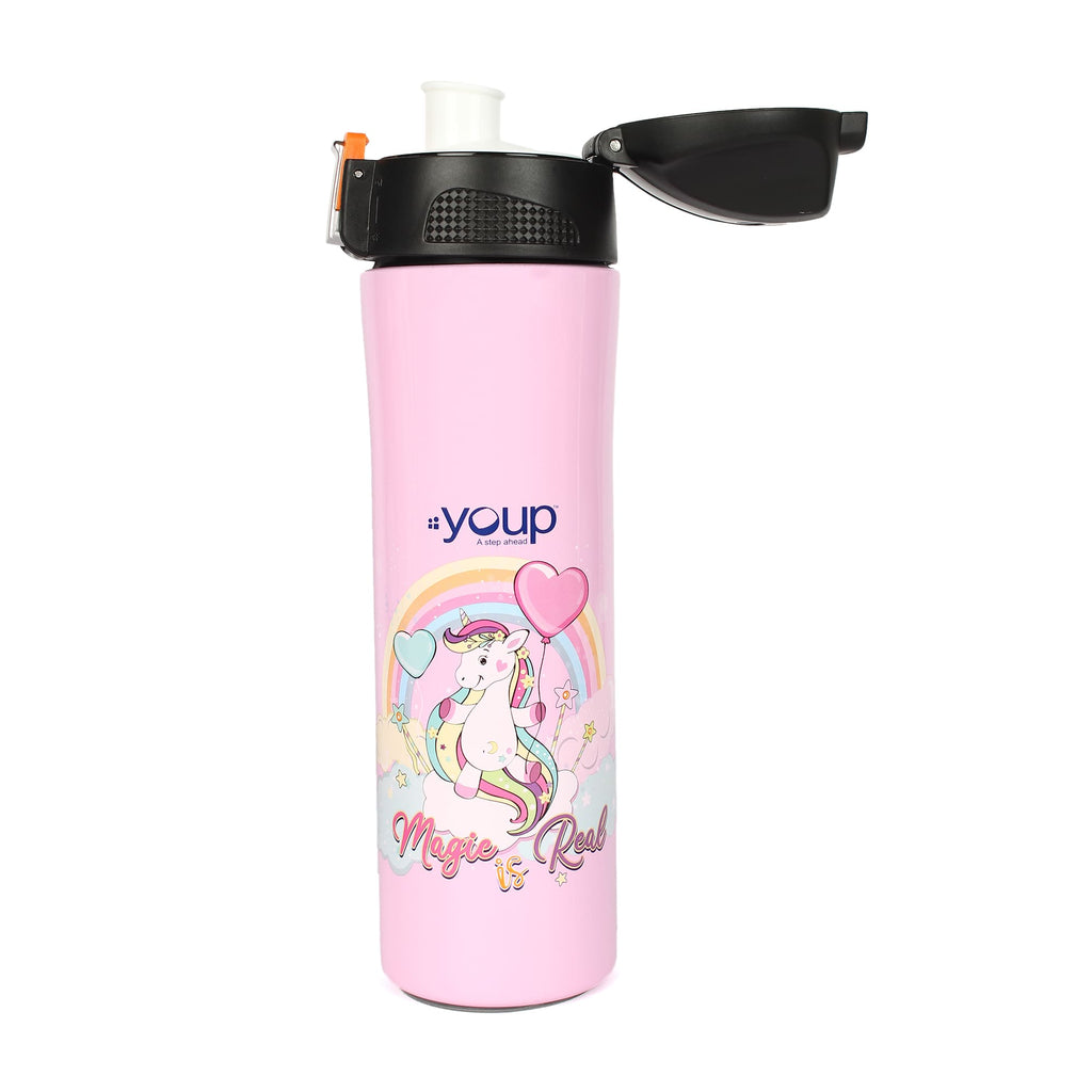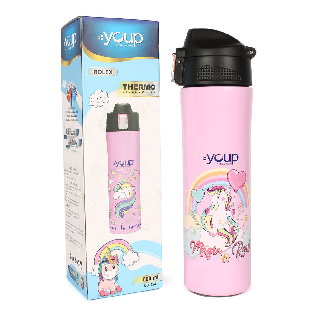 Hot or Cold, As You Need: Rolex by Youp is a stainless steel Unicorn theme kids water bottle of 500 ml capacity is crafted from high quality stainless steel. It can be used for carrying both hot and cold beverages and will retain the temperature of beverages for longer hours.