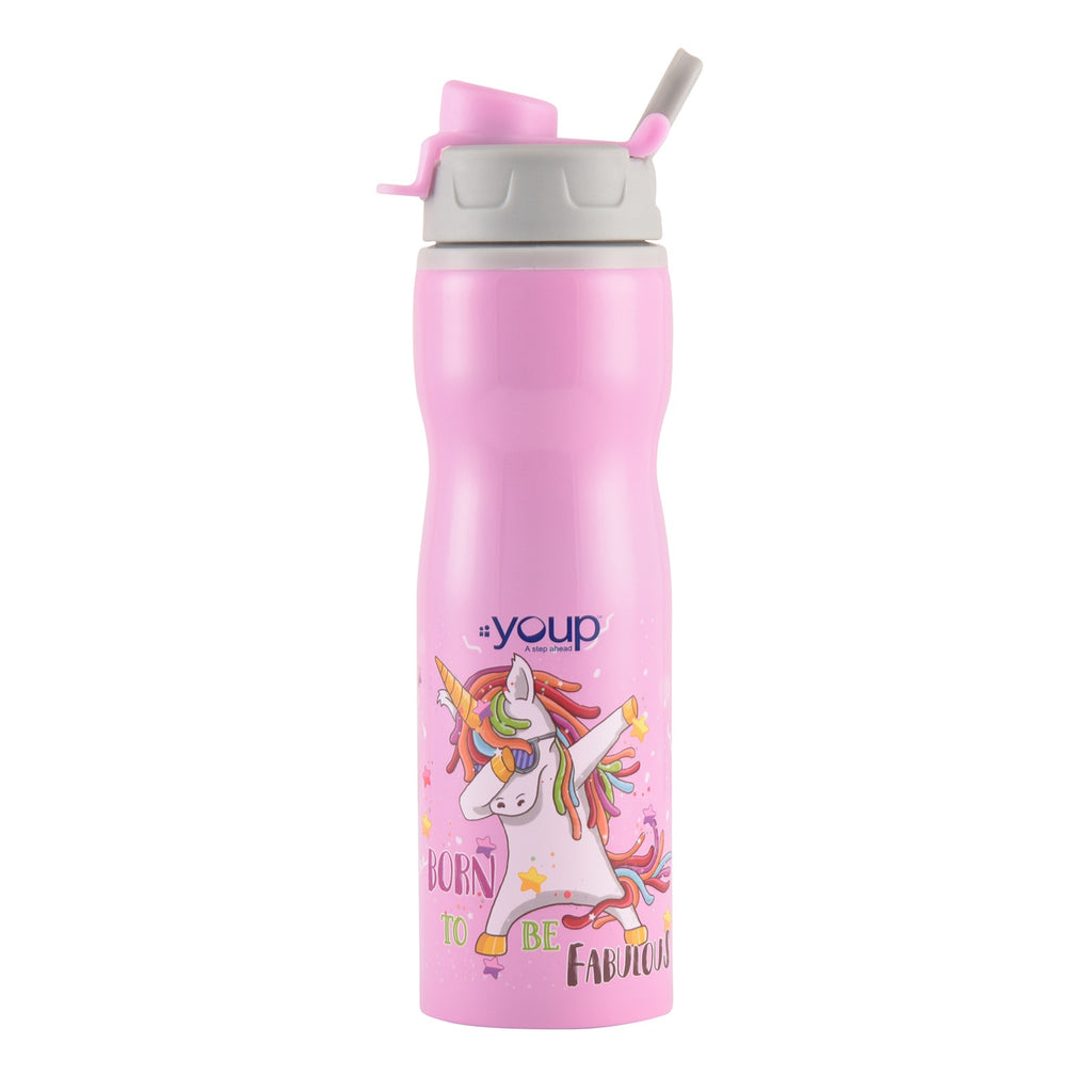 Youp is a non-insulated kids water bottle of 750 ml capacity that is designed on the legendary Unicorn theme which is a craze among kids since antiquity. Crafted from high quality stainless steel, it  can be used for carrying both hot and cold beverages. Its push to open cap and external hard loop handle makes it easy to carry around and pour the liquid in cups or glasses.