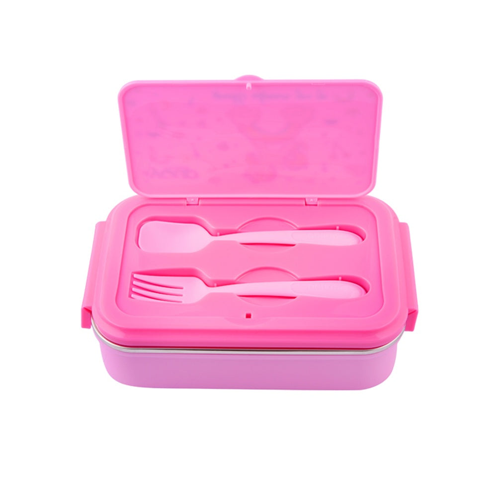 Comes with a lid having an extended fastening design which closes on the box body ensuring absolutely no leakages or sprinkles, giving your child a non-messy meal. Additionally, it also has a push to open upper panel with a fork and spoon inside making it more attractive for kids use. The also comes with a small container inside that is perfect for holding veggies, pickles or ketchup.