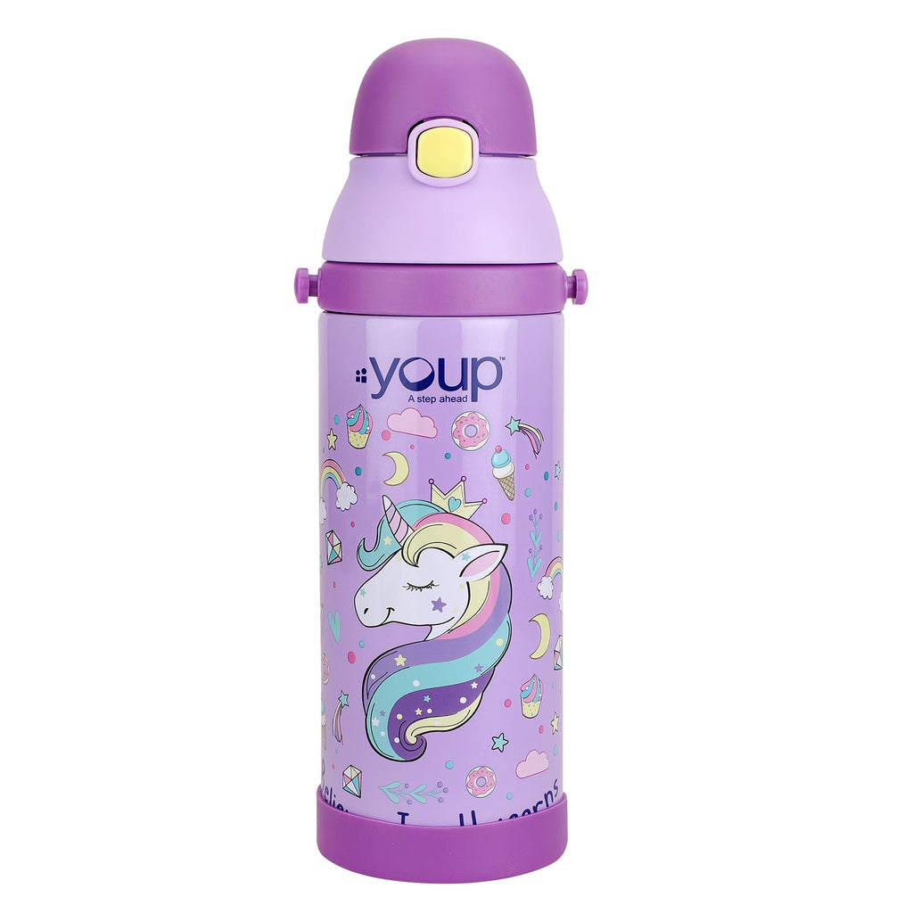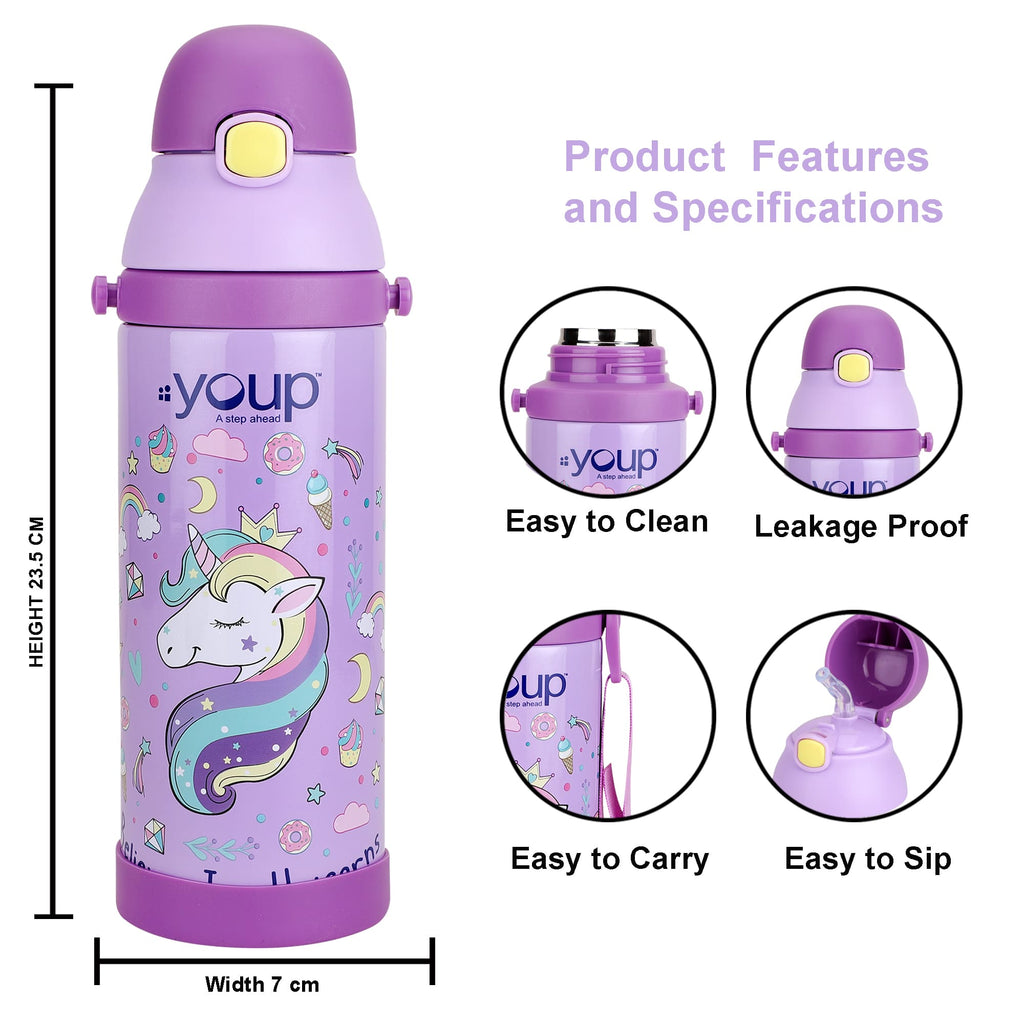 Hot or Cold, As You Need: Winner by Youp is a stainless steel Unicorn theme kids water bottle of 500 ml capacity is crafted from high quality stainless steel that can be used for carrying both hot and cold beverages and will retain the temperature of beverages for longer hours.