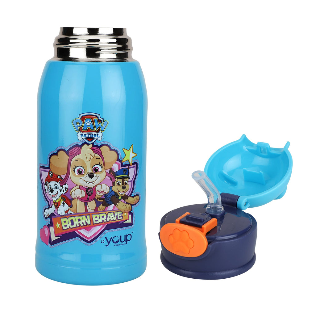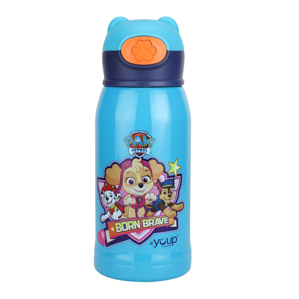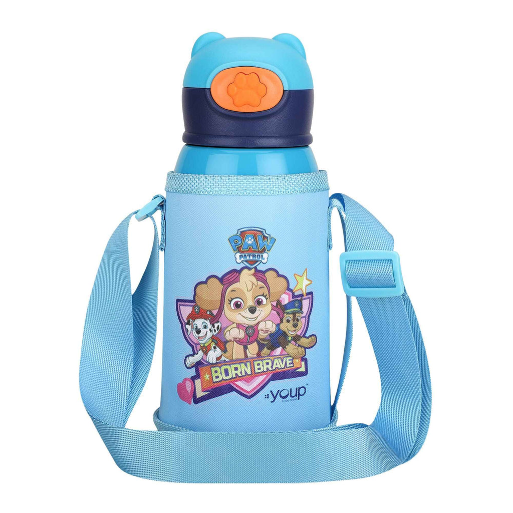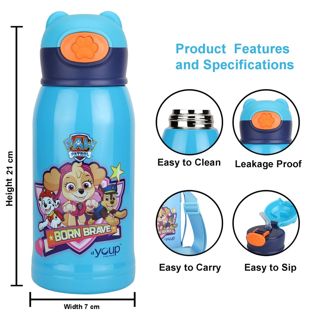 Youp Thermosteel Paw Patrol theme kids water bottle of 550 ml capacity that is crafted from high quality stainless steel. Its press to open cap with straw makes it easy to use for kids. It can be used for carrying both hot and cold beverages and will retain the temperature of beverages for longer hours.the availability of a Paw Patrol printed zipping cover and color matched strap allows for its easy handling by kids.